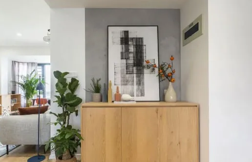 玄关隔断墙加玄关柜是最为妥当的设计方式,更适合面积较大的空间。根据家里的装修风格,对玄关隔断墙进行一些造型设计,再配上合适的玄关柜和装饰画,就能营造出极具设计感和上档次的入户景观。