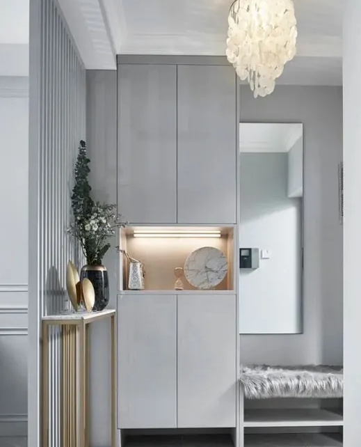 对于绝大多数家庭来说,入户玄关大多会采用定制的鞋柜来设计,既装饰的空间,又解决了鞋子的收纳问题,甚至能够满足更多家居物品的收纳要求。需要考虑的就是鞋柜的外观造型和收纳能力,较好集成换鞋凳的功能。