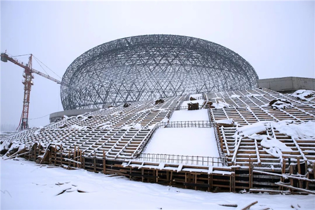 ► 该建筑的外壳共计六层,分别是结构层、承重层、防水层、隔音层、保温层和装饰层。其中,球体的最外层,也就是白色和蓝色相间的三梭椎装饰幕墙最为独特,是国内面积较大的三梭椎异型幕墙墙体。
