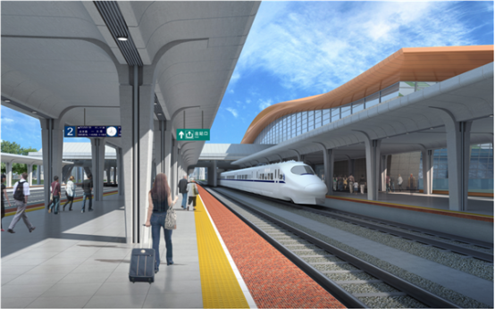 濮阳东站在站房高架平台两侧空间,设置出租车、公交车枢纽平台,利用两侧架空屋面下方空间,供旅客候车及乘降,为旅客遮风挡雨。同时一侧平台上设置空铁联运服务站,增加高铁站与濮阳新机场的交通衔接。