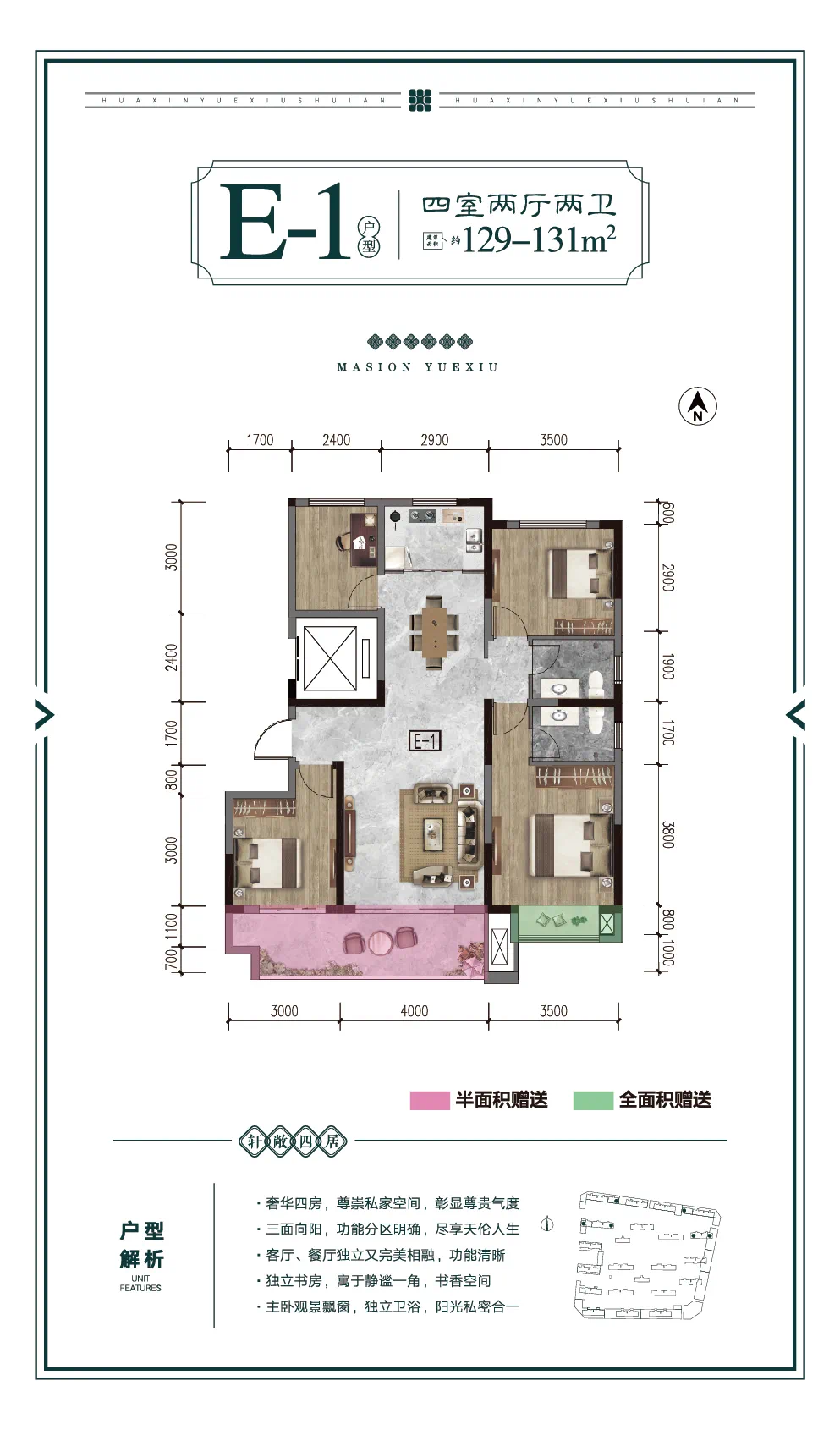 建筑面积约129-131㎡南北通透的户型设计动线合理大开间客厅与餐厅各自独立又优质相融独立书房静谧一角秒变学习主场超大7米阳台诠释花园美居主次卧朝南观景飘窗尽享无敌阳光主卧独立卫浴彰显主人尊贵