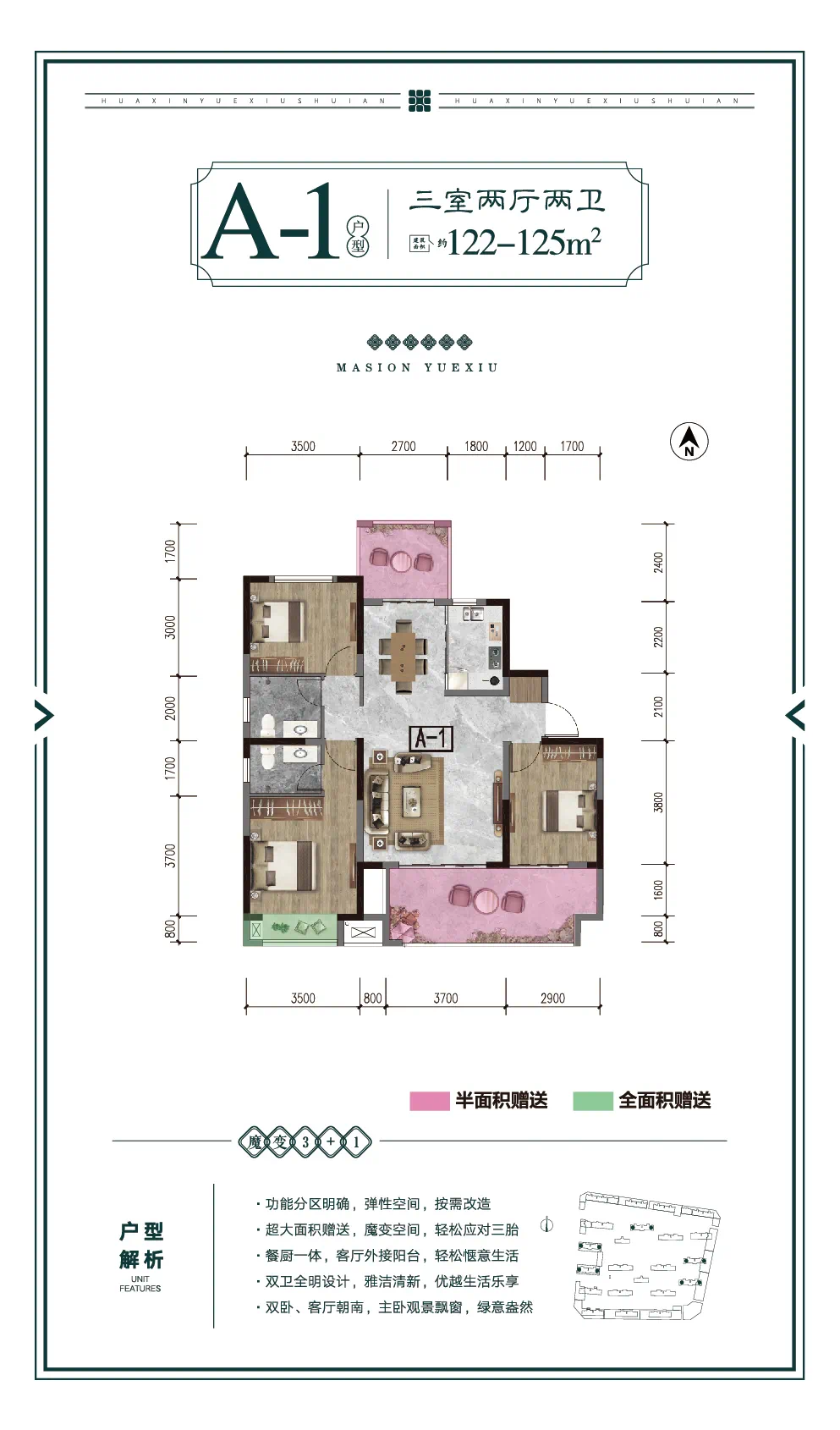 建筑面积约122-125㎡南北通透的户型设计早餐拉开窗帘,阳光便洒满客厅通过客厅步入超大面积阳台呼吸一天当中最清新的空气主卧独立卫生间保证私密性赠送的飘窗给房间带来满满绿意动静分区科学合理孩子的玩耍不影响老人休息双卫全明设计让居住体验雅洁清新从容洗漱互不打扰赠送空间可魔变4室,轻松应对三胎喜事
