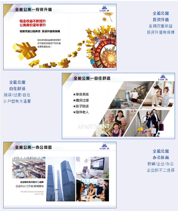 甜蜜升级的爱情公寓、环境优质的陪读公寓、医疗便捷的养老公寓、补习辅导的培训基地、舒奢体面的商务办公,为所“寓”为。