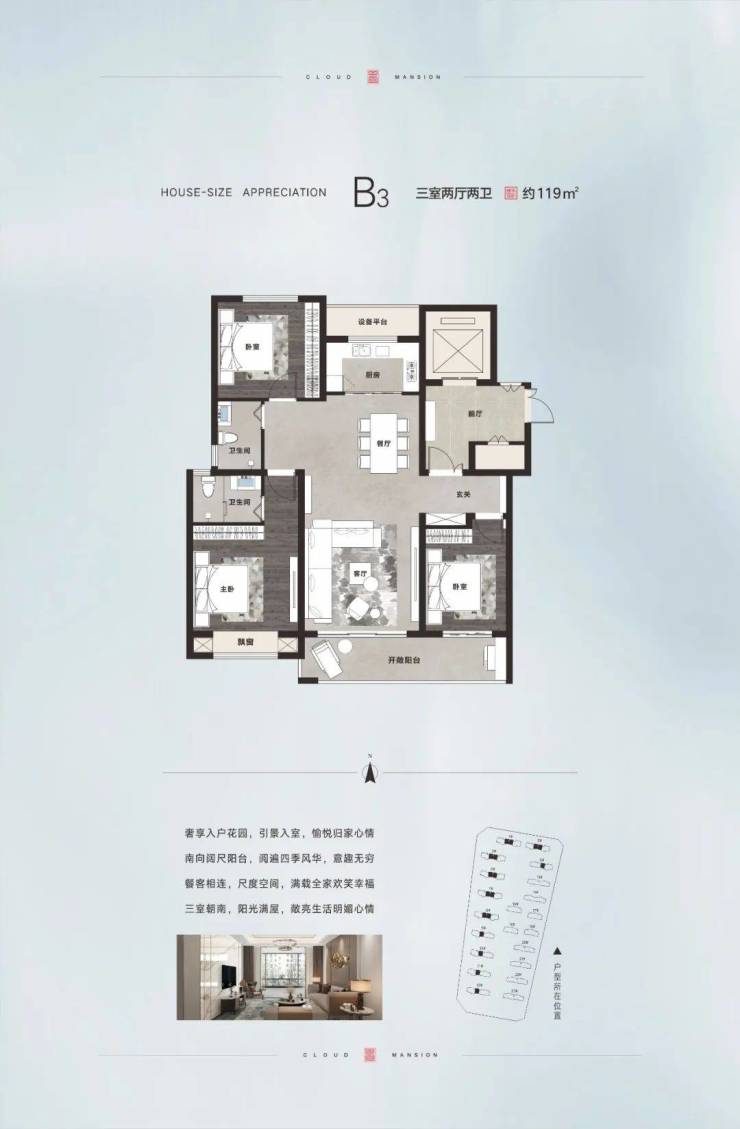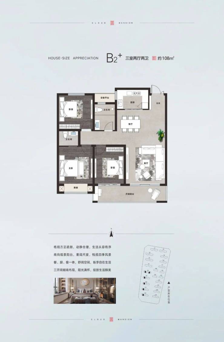 崛起·翎云府,打造建筑面积约177㎡宽幕大平层产品,将尺度格局全线升级,南向整体面宽约17米,五开间朝南,三卧室一宽厅顺势排布,通过功能结构排布及衔接的设计优化,将大平层尺度感再度放大。