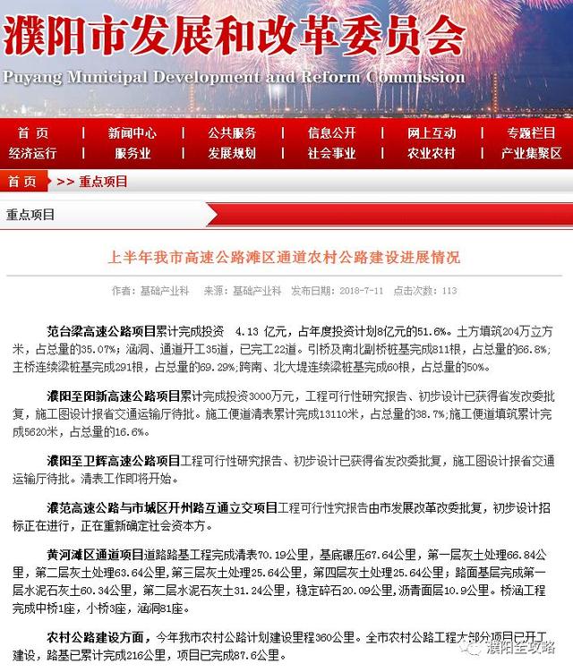 3、濮阳至卫辉高速公路项目工程可行性研究报告、初步设计已获得省发改委批复,施工图设计报省交通运输厅待批。清表工作即将开始。
