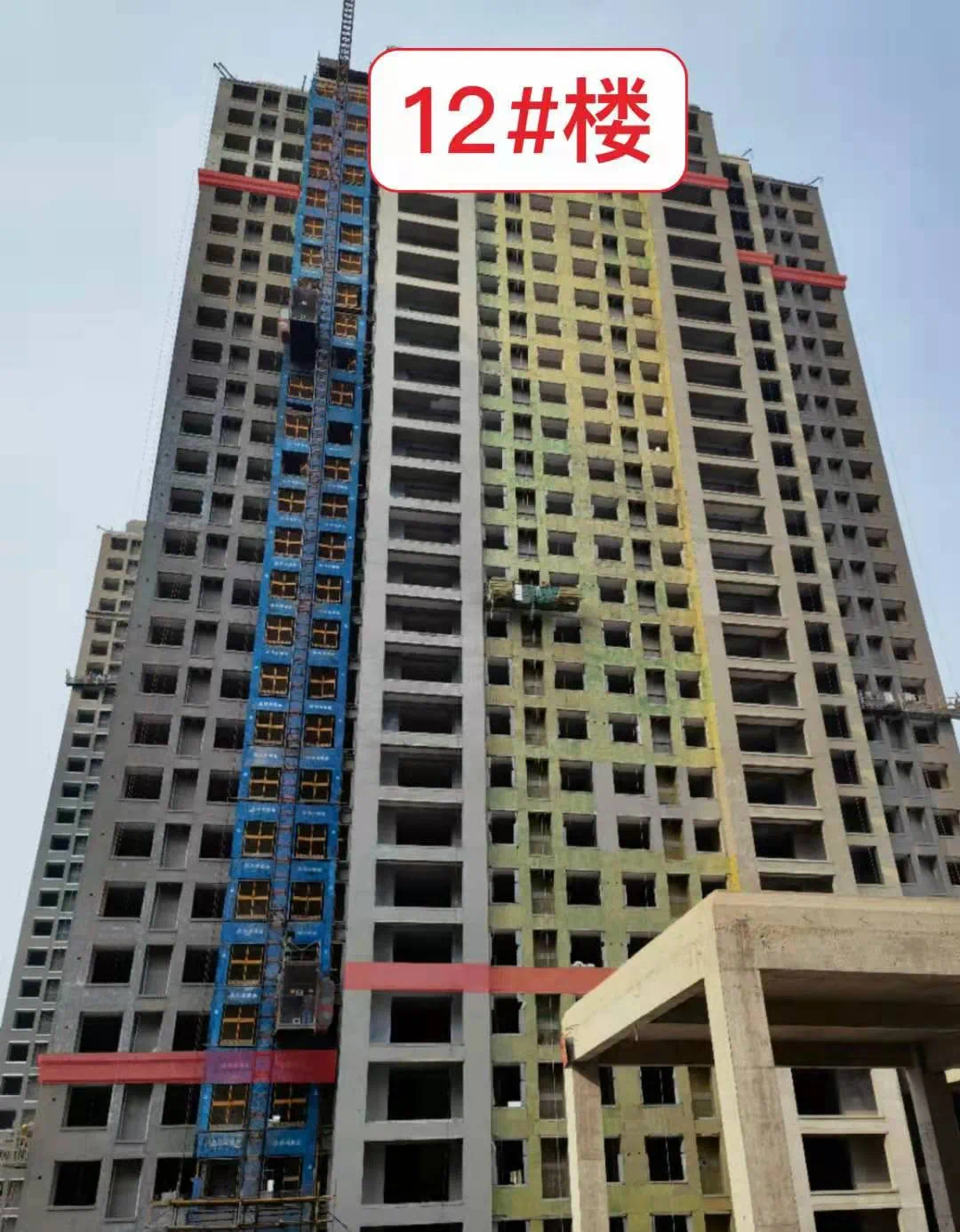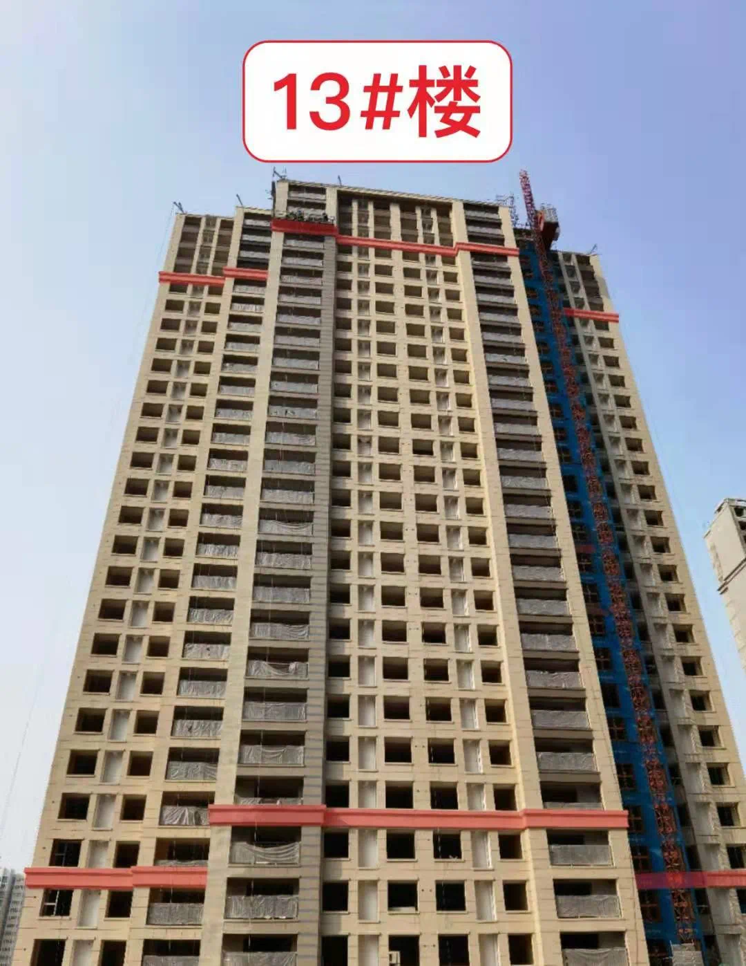 12#楼外墙保温完成85%,内墙石膏粉刷基本完成,涂料已完成10%,内墙水泥砂浆完成,顶板首遍批白完成,连廊地面完成60%。