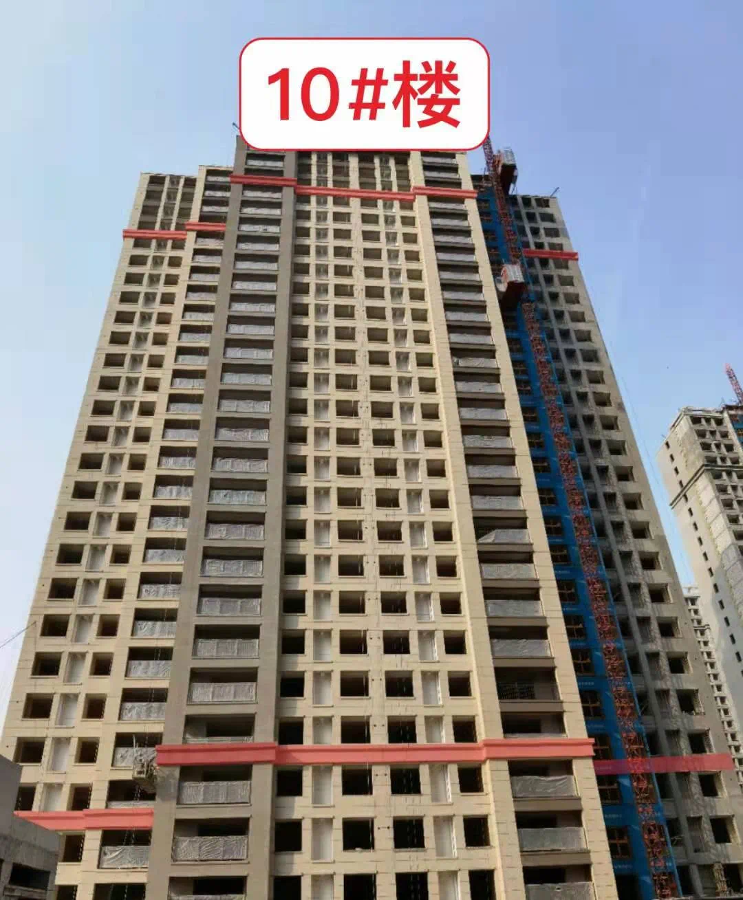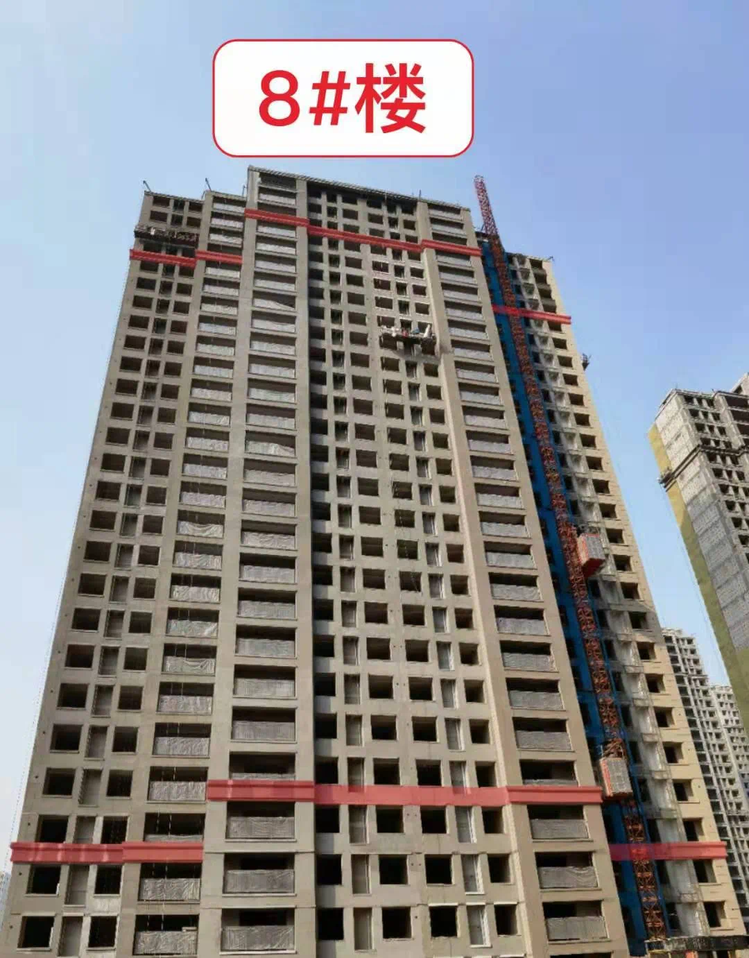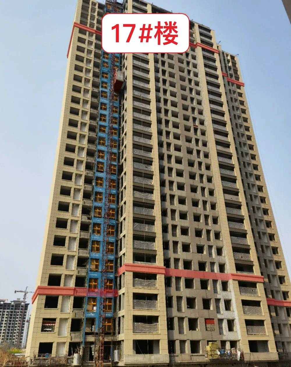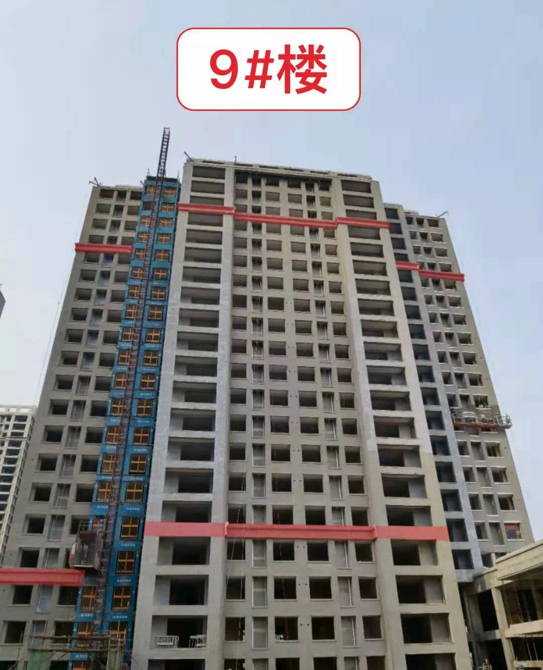 9#楼外墙保温完成80%,内墙石膏粉刷基底完成,内墙水泥粉刷完成,顶板首遍批白完成,连廊公区地坪施工完成。