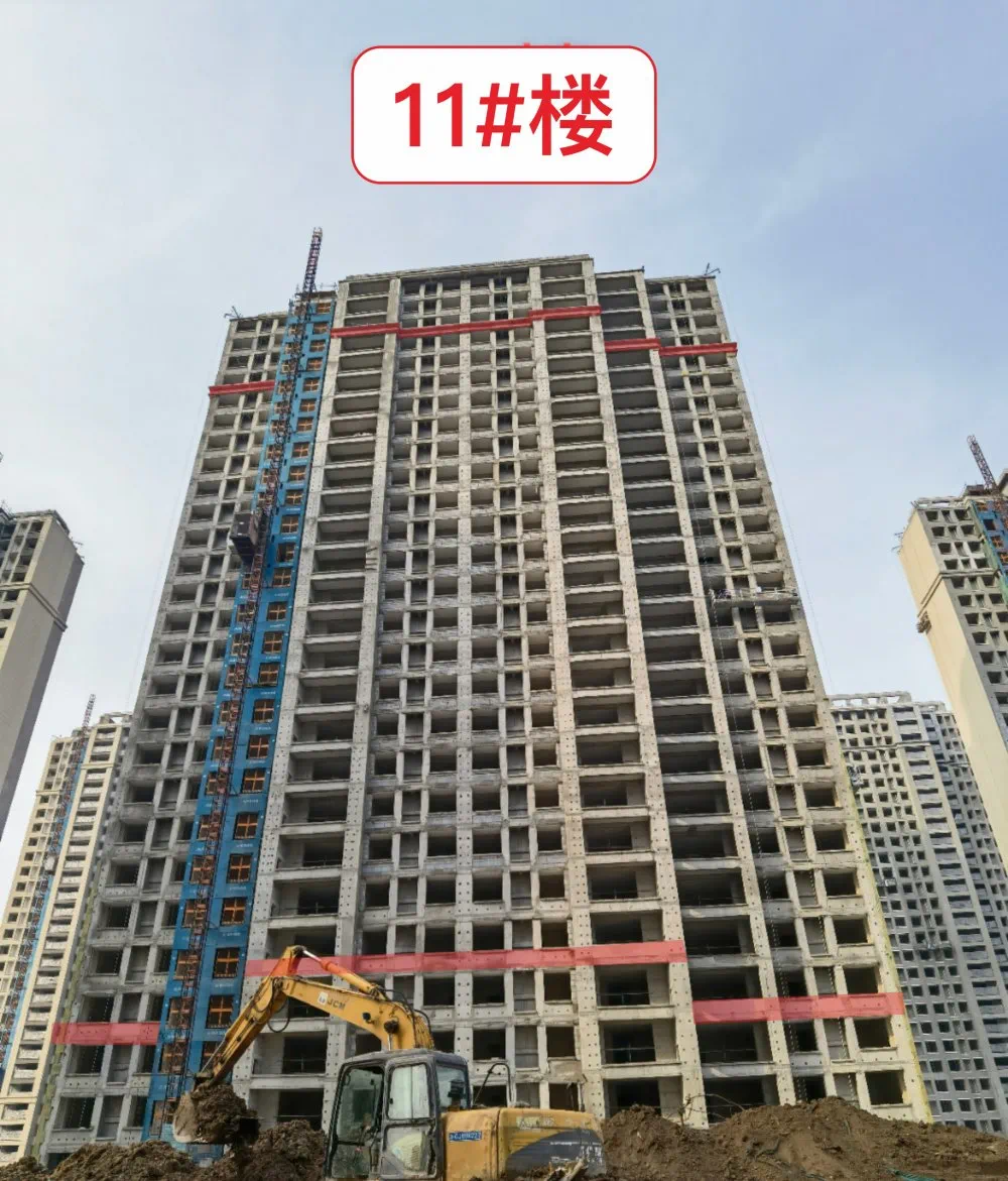 11#楼外墙保温完成30%,内墙石膏粉刷完成基底完成90%,顶板首遍批白完成。
