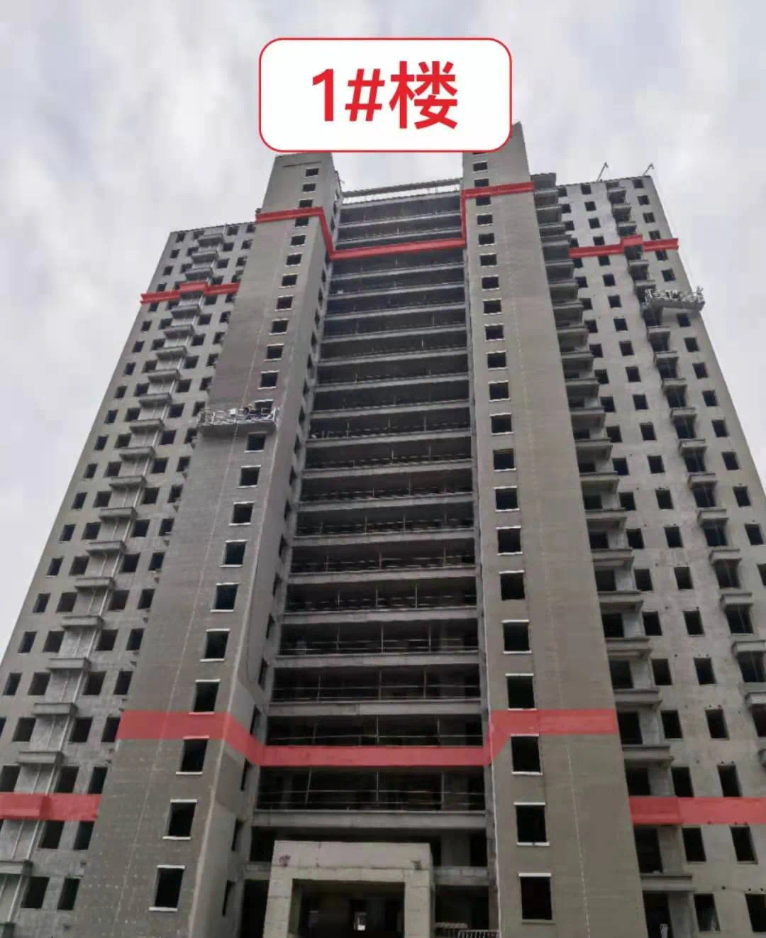 一期室内粉刷完成,外粉完成90%,阳台、连廊栏杆完成,外保温完成90%,外墙涂料完成40%。