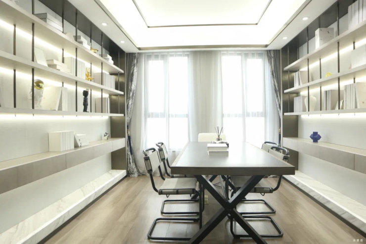 书房面向主卧,脱离休憩空间,结合卫浴空间组合为独立的读书、办公区域。周末清晨,明媚的阳光暖洋洋地打在身上,捧起一本书闲读,倦了就闭上眼小憩一会儿,内心的充实和满足感便是生活赋予的浪漫。