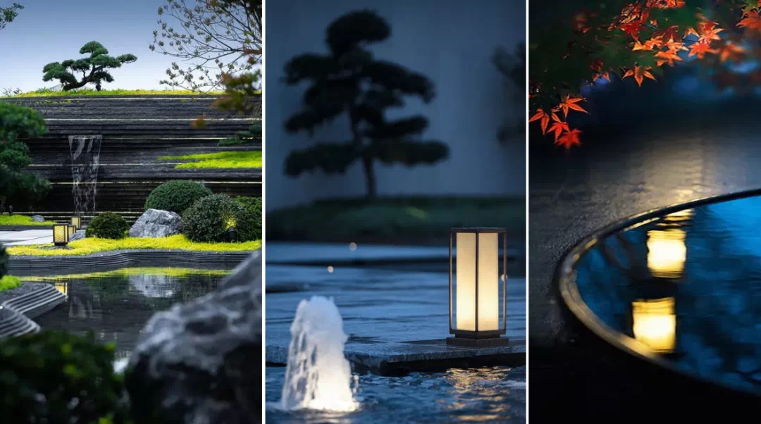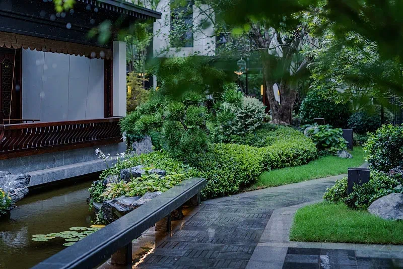 进入归家主场,迎面而来的是皇家礼制阔门的尊崇。石材与宫灯、古窗花结合,叠水、古松、山石和绿植树木交相互映,典雅而沉稳,内敛而不失风度。
