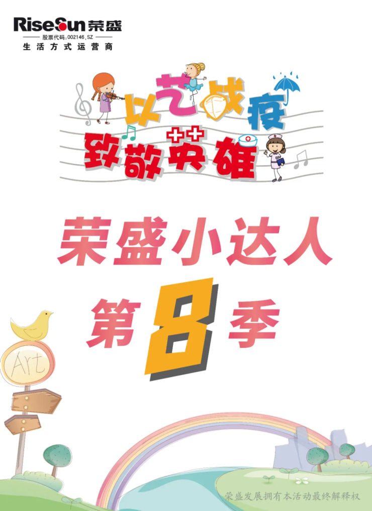 为教育引导广大少年儿童从小铸牢强国使命感,培养正确的人生观和价值观,荣盛发展拟开启荣盛小达人第8季——“以艺战‘疫’·致敬英雄”,以传承民族精神,致敬抗疫英雄为出发点,鼓励少儿发掘抗“疫”过程中鲜活的教育素材,引导广大少儿致敬时代英雄,增强责任意识,厚植家国情怀以及才艺多元化成长,用艺术的形式传递抗疫知识与精神!荣盛小达人通过提供专业化的才艺展示及丰富的交流平台,满足荣盛小业主、荣盛客户的精神生活,开拓视野,提高综合能力,助力中国少年儿童素质教育提升,帮助少儿实现心灵的沟通,在交流与学习中坚强成长。