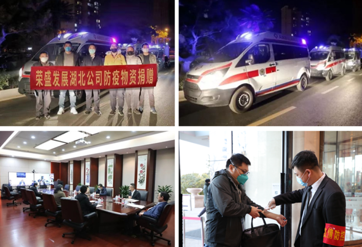 此次新型冠状病毒肺炎爆发以来,荣盛发展更是密切关注疫情进展,全力支持全国抗疫行动,共克时艰,同渡难关,打好打赢这场防疫攻坚战。荣盛发展在董事长亲自带领下,成立防控领导小组,建立防控体制,排名前列时间做出部署,加强防控宣传,营造疫情防控氛围;同时加紧物资采购,保障全员物资配备;强化防控措施,设立防控点、观察室;加强人员监测,进行盘查和量体温;进行工作、公共区域日常化消毒,有效遏制疫情快速蔓延。此外,荣盛发展半个月发动三次捐赠,累计防疫捐赠达到1400万元。1月27日,荣盛发展湖北公司针对武汉疫情进行首批捐赠500万元物资驰援抗疫一线,包含福特监护型救护车、防疫医护人员福利等;2月5日,荣盛发展发起第二批捐赠助力防疫,通过河北省红十字会向湖北、河北防疫一线捐赠现金300万元和价值300万元的福利,共计600万元。2月11日,荣盛发展启动第三批防疫捐赠,捐赠现金300万元支持抗击疫情,用于购买医学防护服等。
