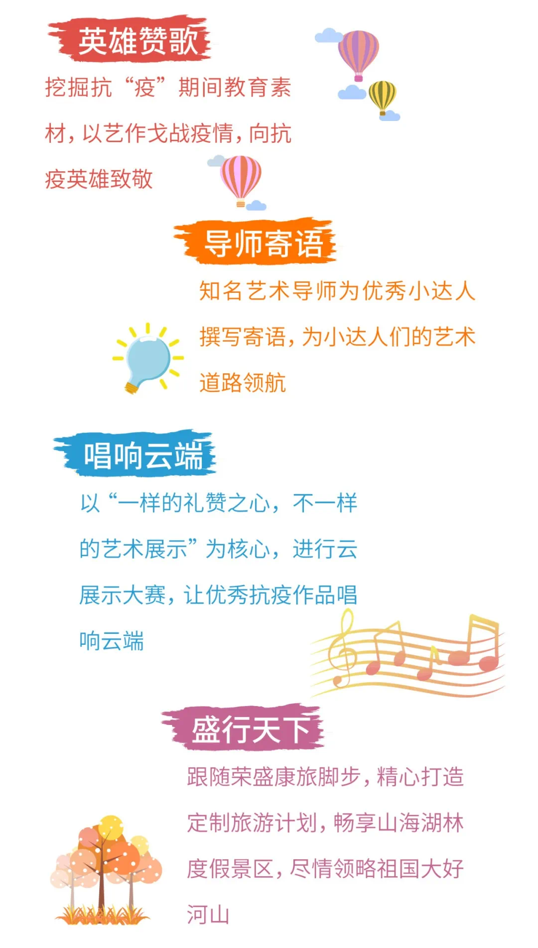 参加海选拿奖品,成功晋级有惊喜!凡入围总决赛评选的作品将有机会参加总决赛云展示评选,并根据参赛才艺特别区分为两个独立竞赛单元:声乐单元——“以艺战疫”,主要包括歌唱、器乐、舞蹈、戏曲等才艺;书画单元——“笔绘风华”,主要包括书法、绘画类才艺,由大众评选出各竞赛单元的前三名优秀作品,分别获得“小达人抗疫传播小卫士”及“小达人抗疫先锋小卫士”称号,同时跟随荣盛康旅脚步,享受定制旅游度假权益1份。荣盛小达人第8季以艺战“疫”,致敬英雄: