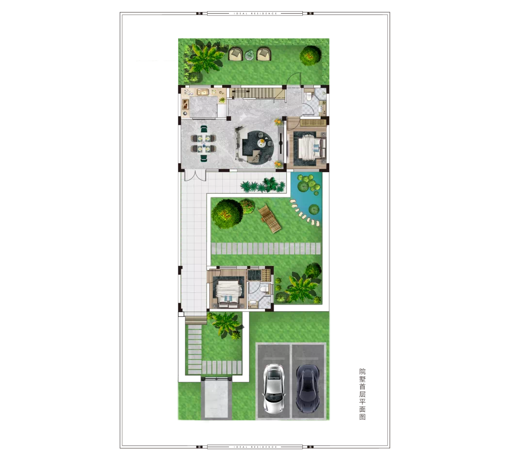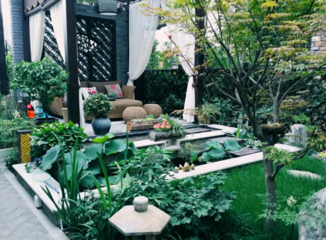 二重院景,敞阔中庭。一汪清池见底缓缓映照时光,几条锦鲤怡然游动其中。墙角栽上几棵心爱的树,桂花也好,海棠也罢,总是为庭院茵茵铺开了风景与韵味。中间摆上几把桌椅,好友造访,可以一起对弈,一起喝茶聊天,亦可在夜晚把酒言欢时共赏繁星点点。