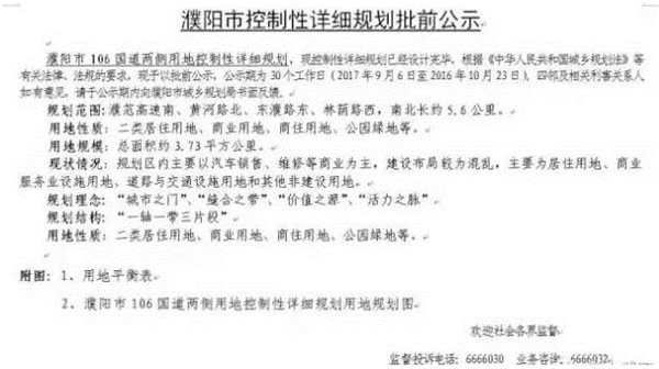 9月6日,市规划局推出一则重磅消息,要对106国道两侧进行重新规划并进行控制性详细规划批前公示,这3.73平方公里将建设成濮阳的“城市之门”、“缝合之带”、“价值之源”、“活力之脉”。