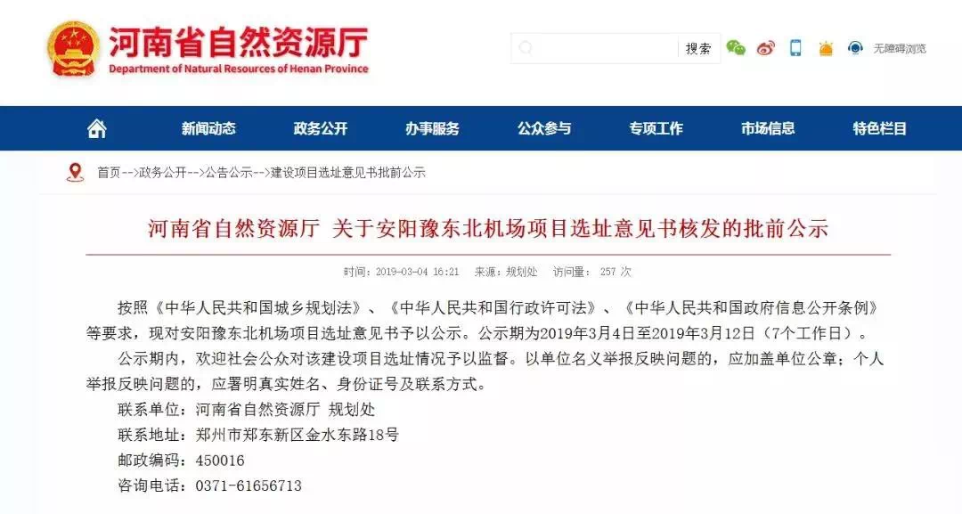 较新消息!河南省自然资源厅对安阳豫东北机场项目选址意见书核发批前公示出来了!