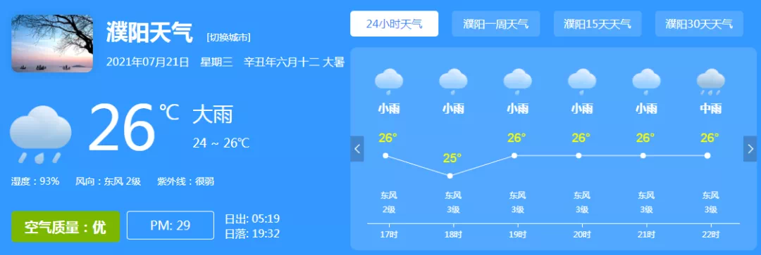 濮阳市气象台2021年07月21日01时31分发布暴雨黄色预警信号:预计未来6小时内,我市市城区、濮阳县、清丰县降水量将达50毫米以上,并伴有短时强降水等强对流天气,请注意防范。