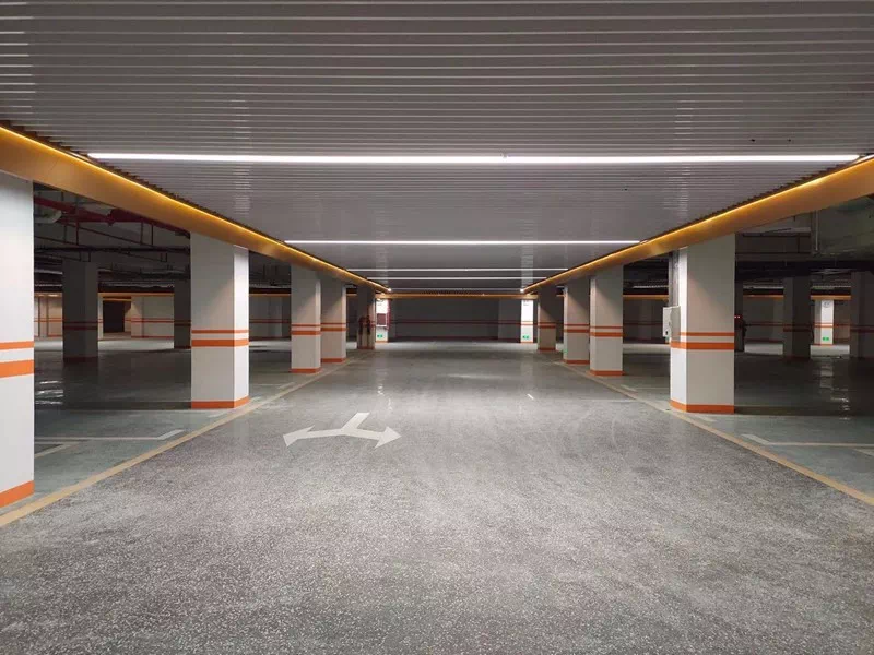地下停车场地面全部采用水磨石工艺,色泽光亮清晰,告别了汽车转向时与地面摩擦产生噪音的困扰;车位分界线均采用镶嵌工艺,颜色对比鲜明,不变色,反光度强;车库内通道全部进行吊顶装饰,并设置了感应灯带,给业主尊贵的归家感受。
