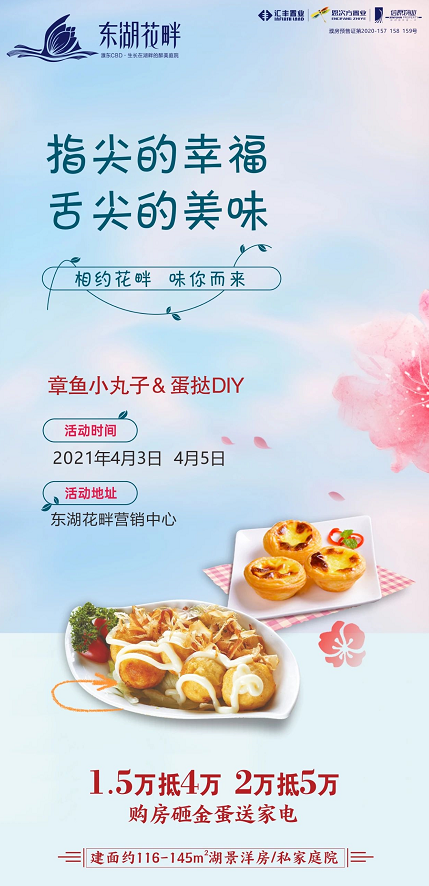 初春暖阳 和风习习初春的色调是明亮的初春的阳光是和煦的在这样一种明亮轻快的情调中开启暖春新味蕾感受浪漫的气息心情也会变得和阳光一样灿烂~ 【东湖花畔】 【享舌尖盛宴 共度四月缤纷好“食”光】 清明小长假 与你美味相伴 现场章鱼小丸子+美味蛋挞 亲自动手制作一份美味 与全家共享甜蜜假期时