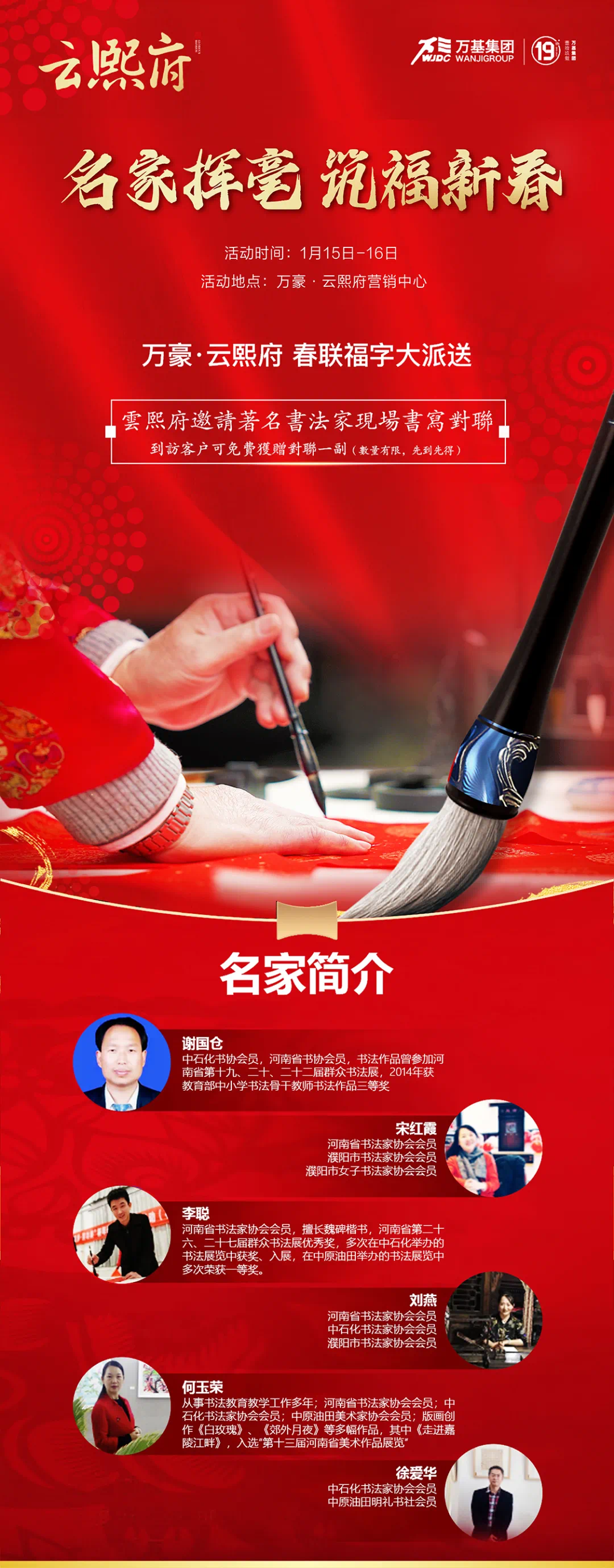 欢乐祥和迎新春,笔墨飘香送祝福。为了传承中华年俗文化,营造喜庆祥和的节日氛围,2022年1月15日-16日,万豪·云熙府开展“名家挥毫 筑福新春”送春联活动特邀六位著名书法家前来为新老客户书写春联,为大家送上最温馨、最真挚的祝福!