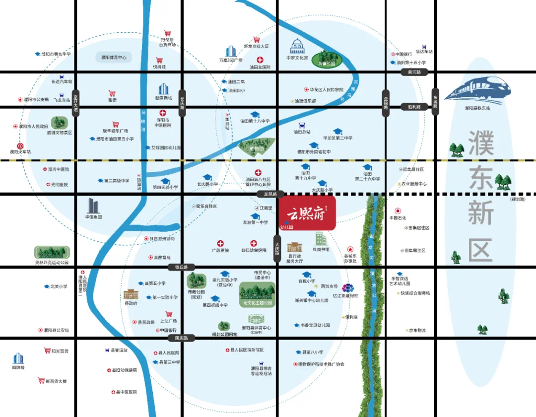 云熙府地处市区、油田、濮阳县三区交汇核芯之地,大庆路油田腹地,大庆路小学、油田第十九中学、第九实验小学、县图书馆、县妇幼保健院、龙文化主题公园等城市配套一应俱全,尽享都市繁华的宁静与尊贵生活的从容。