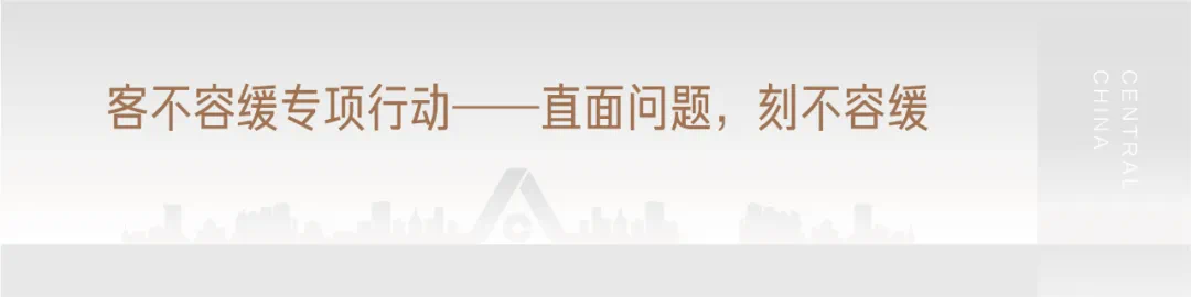 安而不忘危,是安危;无忧必有患,是忧患。面对快速发展下的客诉问题,建业谨记“谁拥有了客户,谁就拥有了未来”的客户观与“没有任何理由向客户提供有瑕疵的产品,没有任何理由向客户提供二流的服务”的产品服务观,刀刃向内,自清自检。╟2020年7月24日,建业集团召开“客不容缓——建业集团客诉专项治理百日行动”动员会。直面客户服务过程中的不足,并提出改进提升的举措,确定85%以上的处结率目标。╟濮阳建业协力响应,全面部署。在每个项目设立总裁投诉热线,让客户投诉直达总裁。对于总裁受理投诉采用“每日群内跟盯,每周城市公告”模式,及时回复客户,提高客诉处理时效。 ╟同时,设定项目总接待日,同时进行线上&线下多渠道宣传,以“周”为单位开展,公示“城市总、项目总、客服经理、物业经理”电话,变被动为主动,全面搜集并解决客户问题。