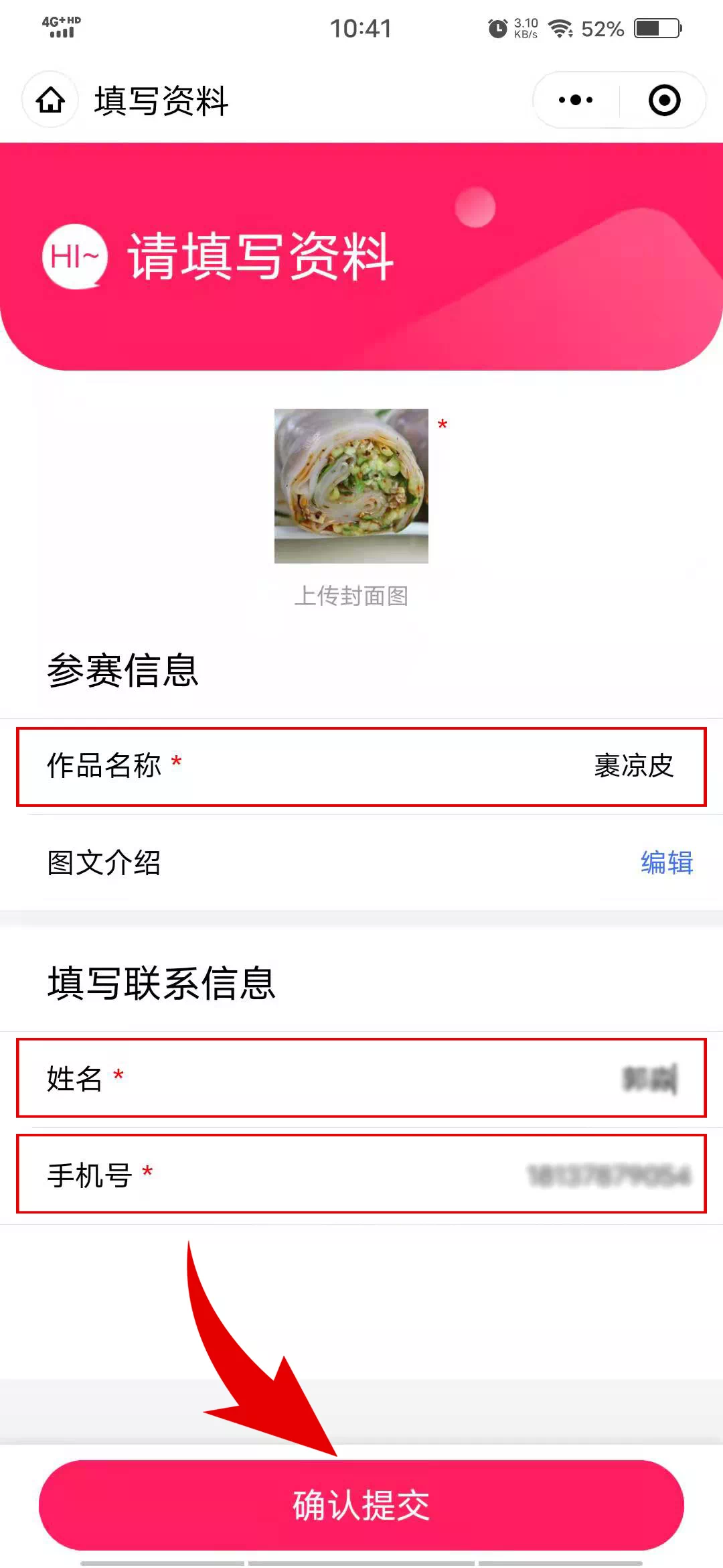 上传照片→填写美食名称→填写姓名电话→点击提交