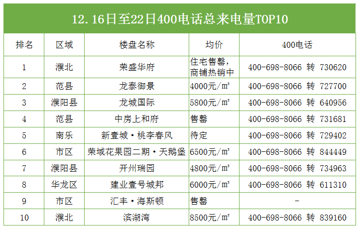 不少人在买房时总会问“濮阳哪个楼盘较受欢迎?”其实在小编看来,一个人说好那不叫好,大家说好那才是真的好,而400电话数据就是衡量购房者对楼盘的一个非常直观的标准,大家的眼光才是雪亮的。接下来小编就为给各位网友说道说道12月16日至22日一周濮阳楼市400电话情况。