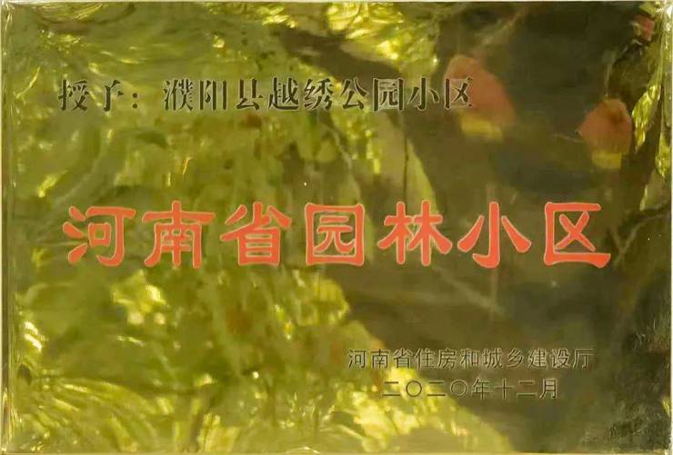 2020年越绣公园荣获河南省园林小区,2019年越绣公园荣获濮阳市级园林小区,2018年越绣花园荣获濮阳市级园林小区,已经交付的小区连续被评为省市级园林小区。
