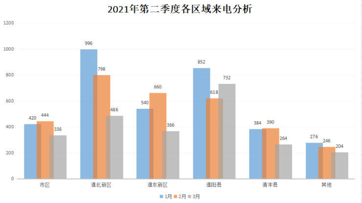 通过400来电数据分析,自2021年4月至6月各区域来电分析,各区域呈现下降趋势,濮北递减趋势比较明显,六月份比四月份递减下降34%;其他区域每月来电涨跌幅度不发。总体来说2021年第二季度依旧是濮北来电量较高,深受广大购房者的青睐。其次是濮阳县,濮阳县2021年第二季度比2021年排名前列季度400来电量上升15%。本季度,濮阳县成为了大家关注的另一个对象,濮阳县的配套和交通也在不断建设升级。对于刚需,濮阳县也是一个不错的选择。