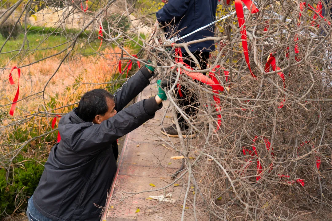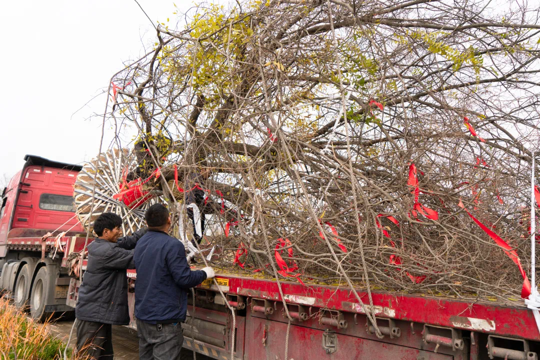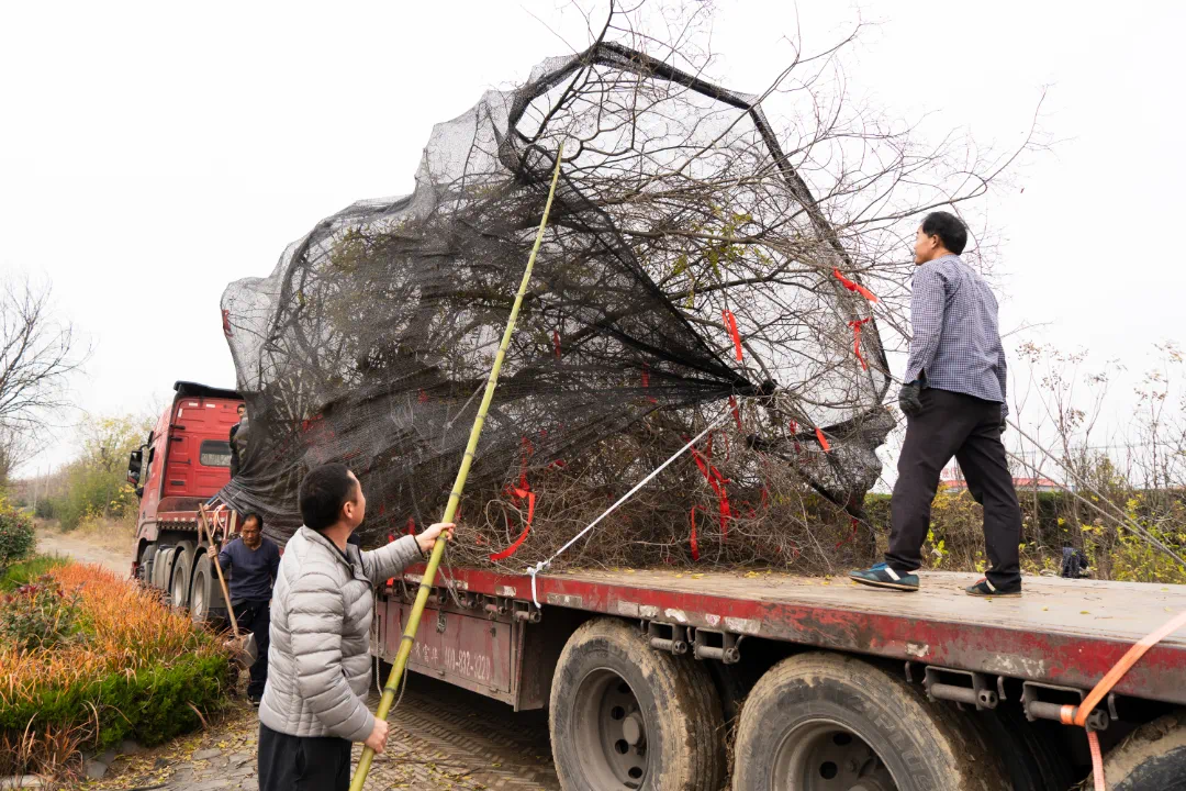 最后,为了装车途中减少长途运输对枝干的磨损,特请当地从业25年的专业师傅进行收枝工作。移植工作一直从早上忙到黄昏,为了保证古树健康安全的到达项目,移植运送工作必须马不停蹄一步到位。