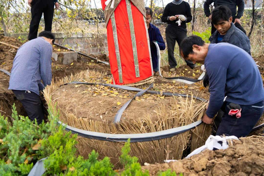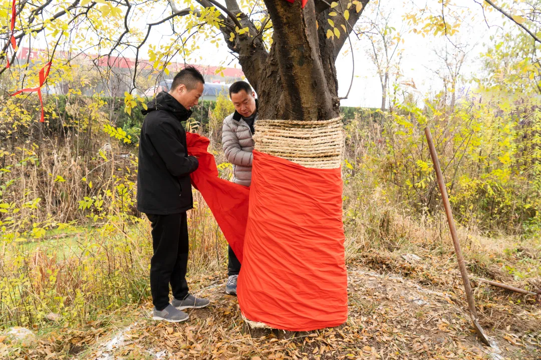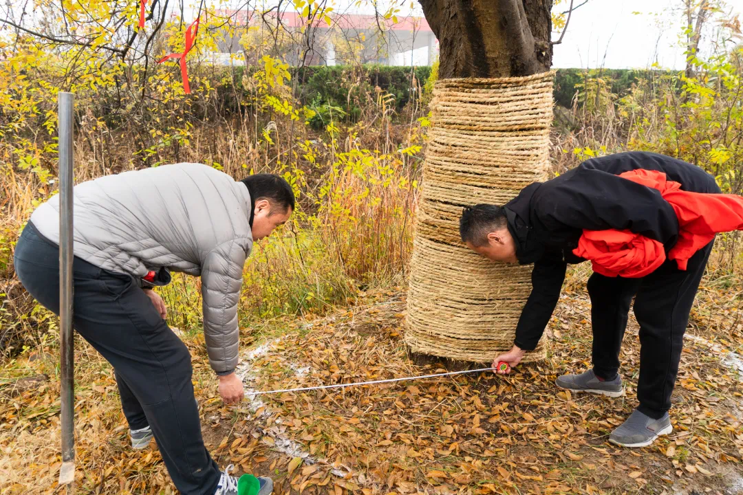 在古树移植过程中,项目人员和园林人员对树木根茎进行了仔细的测量,确定树球根部的包裹方案,测量树球直径的大小,并以非传统的方式,在四周撒上白色面粉,既能做到零污染,又不伤害根系。在需要进行包裹的位置全部采用草绳,喷洒保湿水,更便于运输过程中的树木保湿。