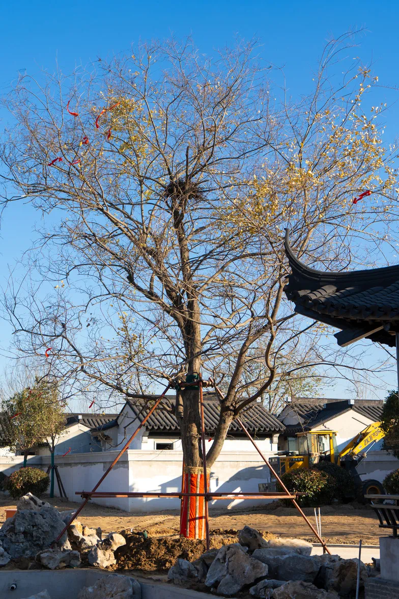 树,特别是买有年份的古树,除了要舍得下成本,更要讲求缘分。由于社区的景观规划早已敲定,所以对古树的胸径,高低都有着非常苛刻的要求,在项目组赵总的带领下,团队经过整整7天的实地探寻,终于找到那两棵期待已久的百年古朴树。虽然已经初冬,依然是枝繁叶茂,由青转黄的树叶映衬着湛蓝色的天空,秋日美景令在场所有人心动,我们似乎已经可以看到有了古树后更加美丽的社区···