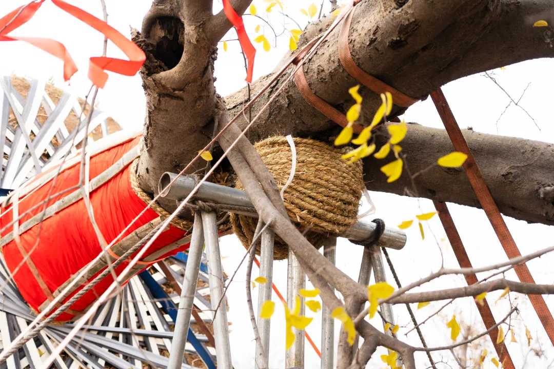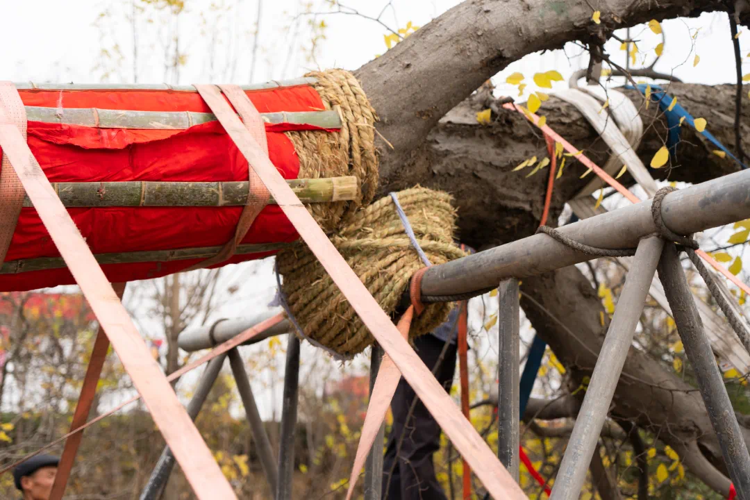 为了防止在起吊过程中因受力过强而折断,相关人员经过多点位的力学分析,事先在需要捆绑绳索的地方用竹板固定包裹。为了避免在运输途中因碰撞而导致的脱皮和损伤,对必要的部位进行了一系列的缓冲和防护。定制安放树干的马凳,并在马凳上铺垫草绳,以便减少运输过程中可能会产生的摩擦,同时为了防止沿路的冬季大风天气,特将整棵古树盖上遮阳棚整体保护起来。