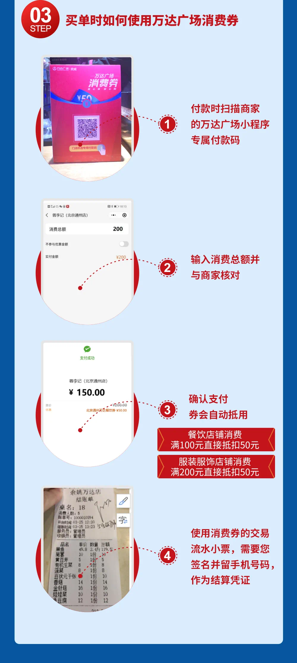 领取消费券后能享哪些优惠呢?领到消费券的顾客就相当于拿到了万达给的50元现金,4月1日起,成功领取消费券的消费者,按活动规则可在万达广场参与活动的餐饮类商户享受满100直接抵用50元消费券,在服装服饰类商户享受满200 直接抵用50元消费券的实在优惠,让消费者在万达广场安心购物重启买买买模式。
