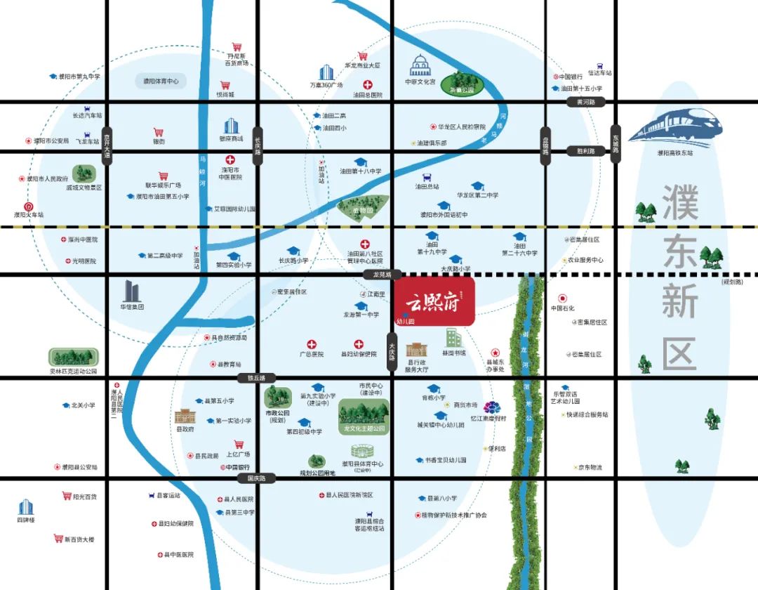 资源集萃 繁华贯通繁盛云熙府地处市区、油田、濮阳县三区交汇核芯之地,大庆路油田腹地,大庆路小学、油田第十九中学、第九实验小学、县图书馆、县妇幼保健院、龙文化主题公园等城市配套一应俱全,尽享都市繁华的宁静与尊贵生活的从容。