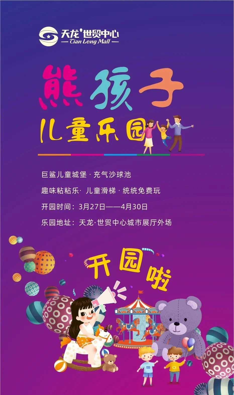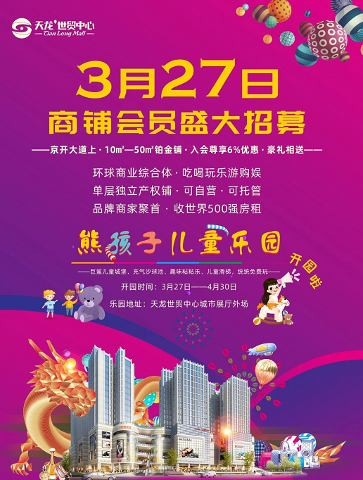 天龙·世贸中心3月27日商铺会员盛大招募,熊孩子儿童乐园同步