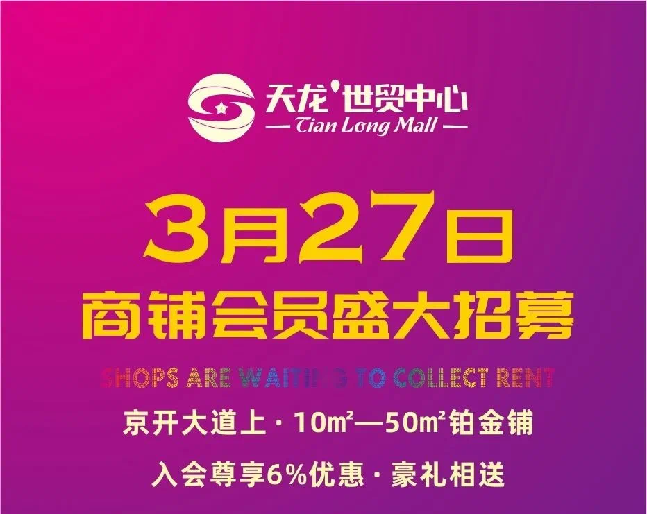 天龙·世贸中心,环球系列商业综合体,强大商业号召力,招商先行,永辉生鲜超市、大堡礁儿童乐园、歌迷KTV、永乐电器、屈臣氏、豪享来、肯德基、胜道体育等主力商家聚首,大树底下好乘凉。收世界500强房租,与商业大鳄共享财富盛宴,铺铺都是黄金屋。