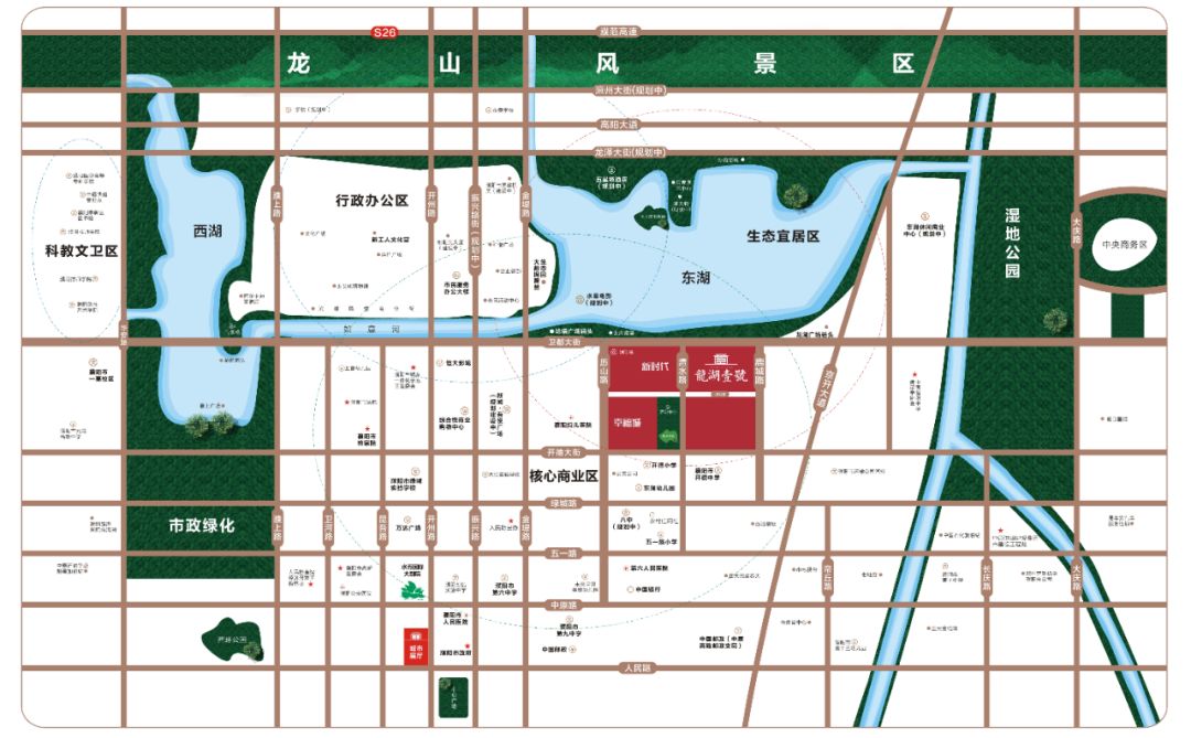 龙湖壹号·新时代位于国家历史文化名城濮阳市濮北新区行政景观核心区内,北临卫都大道,西承历山路,与万亩龙湖隔路相望,占据优越自然风景与城市发展方向核心以及紧临优质中小学,坐拥三重稀缺资源,更为难能可贵的是不可再生的一线临湖地块,依靠一线湖景,亲水而居,尽享自然之美,领略万亩龙湖的浩渺烟波,更兼有29公里“龙湖”绿色生态走廊,可谓世间少有,错过难再得。