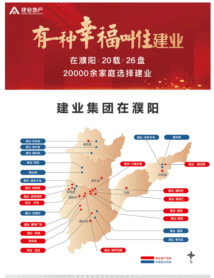 直至2016年,建业在濮阳县域用十年时间,精心打造了一处集教育、住宅和商业配套为一体的国际化高品质居住社区,是县城较大的社区,也是城市首席景观社区。建业城成为濮阳县排名前列个拥有市政供暖、排名前列个采用外墙保温,以及排名前列个拥有自己学校的社区。同时,还是排名前列个拥有2000㎡滨水商务会所,配备有游泳馆的社区,排名前列个拥有12000㎡樱花主题公园的社区……