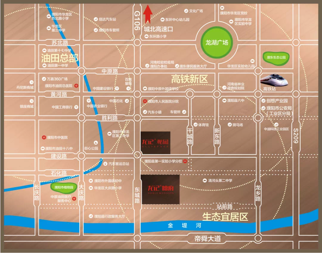 濮阳龙记观园距濮阳高铁站只有3公里,目前高铁站已动工,预计2021年试运营,四十分钟就可到达郑州或济南两大省会城市,大大节省了时间成本,未来发展潜力和提升空间巨大。再加上106国道开始东移并扩宽70米,改名为东城路,道路两侧设置70米宽的景观绿化带,同时,市政府将在高铁站旁规划汽车站与公交站,沿东城路向北至濮范高速、濮阳北站仅10分钟车程,项目北侧和南侧分别是两条贯穿濮阳东西的胜利路及建设路,建设路将在今年年底之前全线贯通,三条主干道环绕,满足生活多样出行。