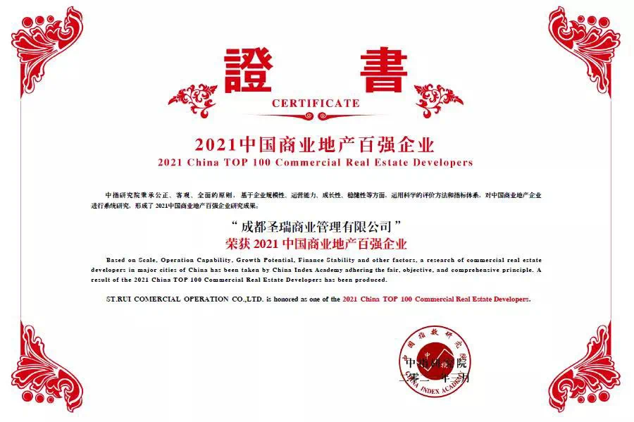圣桦集团凭借稳健发展再度荣膺“2021中国房地产百强企业”,排名跃升至第87位,集团旗下成都圣瑞商业管理有限公司蝉联“2021中国商业地产百强企业”称号。