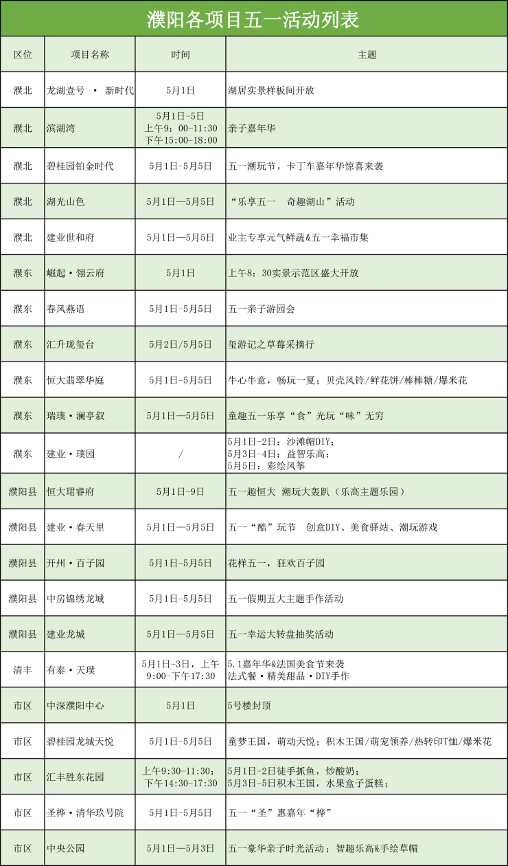 它来啦,它来啦! 它踏着坚定不移的步伐到来啦! 五一期间濮阳项目各种活动让你玩到嗨! 5月1日-5月5日 五一小长假 小编为你准备好了玩乐航线 濮阳房产缤纷活动持续举行 玩都玩不过来啦! 小编搜罗“五一”期间濮阳各大楼盘的活动信息,让您在“五一”期间轻松度过小长假! 敲黑板划重点 精彩活动不容错过