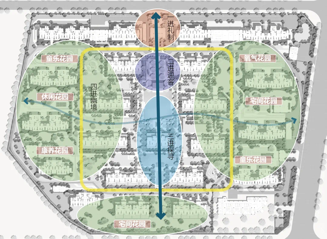 项目社区园林汲取乾隆花园的皇家造景理念,传承东方礼制之精髓,匠心雕琢“1环、2轴、4进、7景”的景观结构,秉承“一进礼制、二进迎客、三进探寻、四进幽境”的传统园林仪仗礼秩,定制归家入户的每一步礼仪。