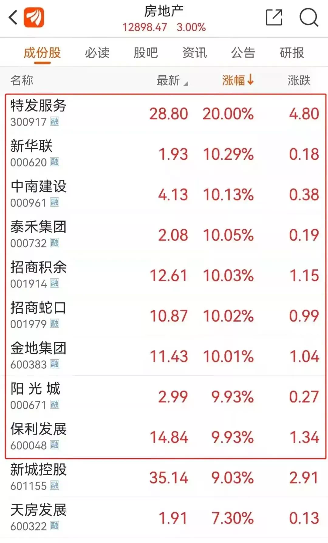 11月的多重利好让地产股迎来大涨,申万房地产板块涨幅高达5.92%,物管股特发服务涨20%,新华联、中南建设、招商蛇口、金地集团、保利发展、泰禾集团、新城控股、阳光城等多股涨停。