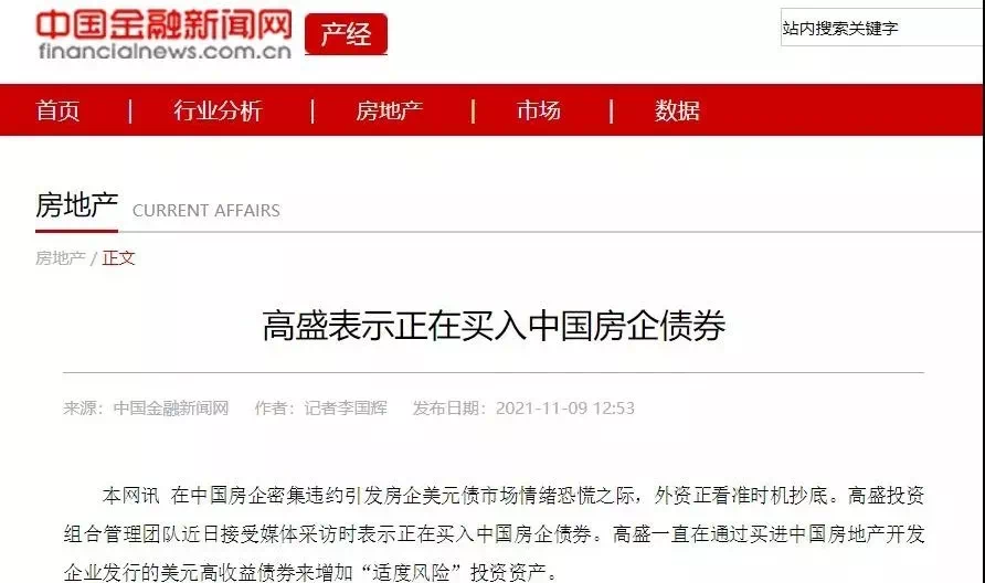 11月9日,央行旗下《金融时报》发布消息:高盛表示正在买入中国房企债券,通过买进中国房地产开发企业发行的美元高收益债券来增加“适度风险”投资资产。