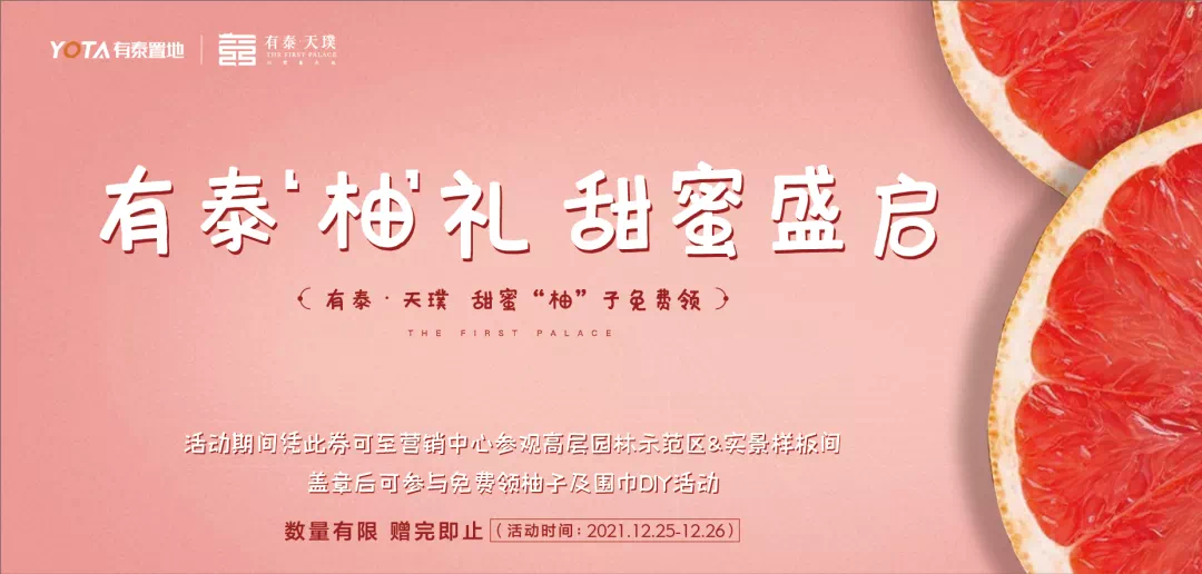 12月25日上午10:00,有泰·天璞高层园林景观示范区&实景样板间即将惊艳绽放,在这个特别的日子里,有泰·天璞蜜柚免费送,一颗颗甜蜜多汁的臻选鲜柚席卷而来,等你带回家!