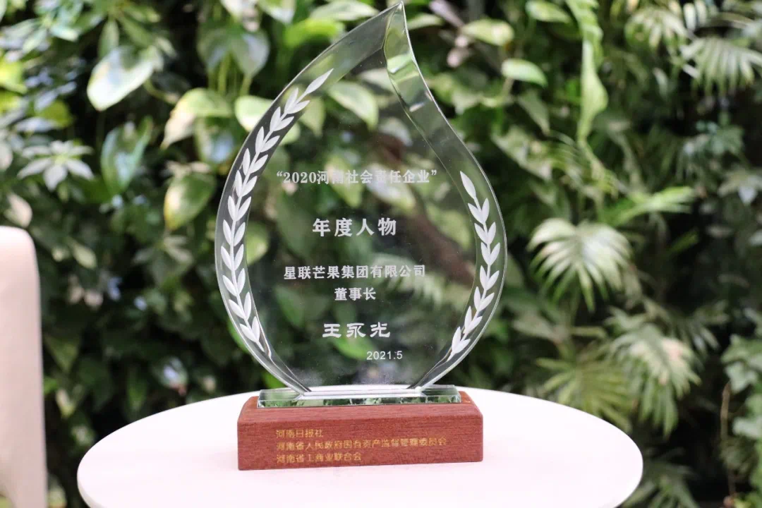 5月21日,由河南日报社、河南省国资委、河南省工商业联合会联合举办的“2020河南社会责任企业”及“2020社会责任突出贡献企业家”推选活动颁奖仪式在郑州黄河迎宾馆举行,本次活动共有500多家企业参与,星联芒果集团荣膺“2020河南社会责任企业”年度企业奖,王永光董事长荣膺“2020社会责任突出贡献企业家”年度人物奖。