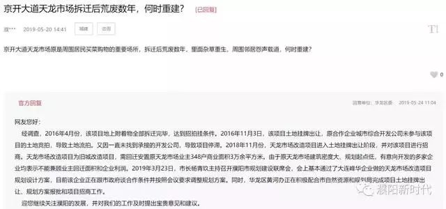 经调查,2016年4月份,该项目地上附着物全部拆迁完毕,达到招拍挂条件。2016年11月3日,该项目土地挂牌出让,原合作企业城市综合开发公司未参与该项目的土地竞拍, 导致土地流拍。又因一直未找到承接的开发公司,导致项目停滞。2018年11月份,天龙市场改造项目进入土地挂牌出让阶段,并对该项目进行招商。天龙市场改造项目为旧城改造项目,需回迁安置原天龙市场业主348户商业面积3万余平方米。由于原天龙市场建筑密度大、规划起点低,有意向开发的多家企业均表示不能兼顾业主回迁面积和企业利润。2019年3月23日,召开濮阳市规划建设联席会,会上基本通过了大连峰华企业做的天龙市场改造项目规划设计方案,目前该企业正在跟市政府谈合作条件并按照会议要求调整规划方案。同时,华龙区黄河办正在积极配合市自然资源和规划局完成项目土地挂牌出让、规划方案报批和项目招商工作。